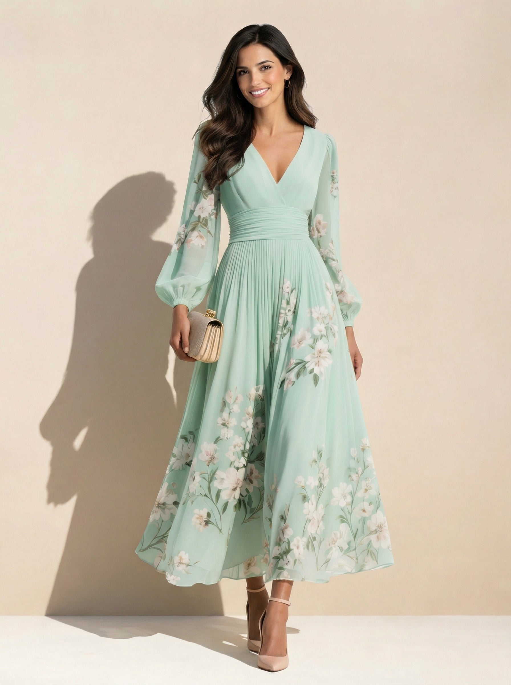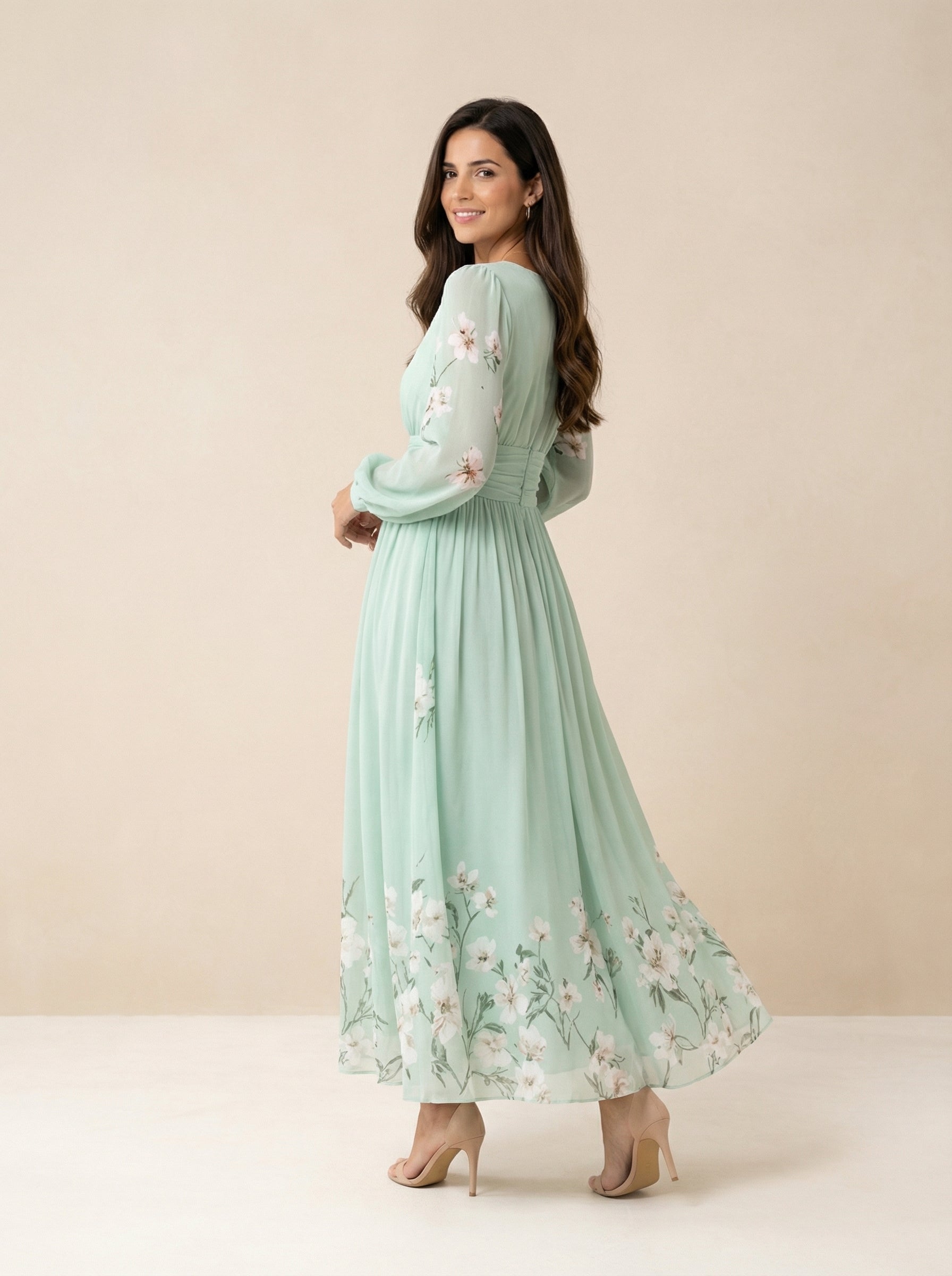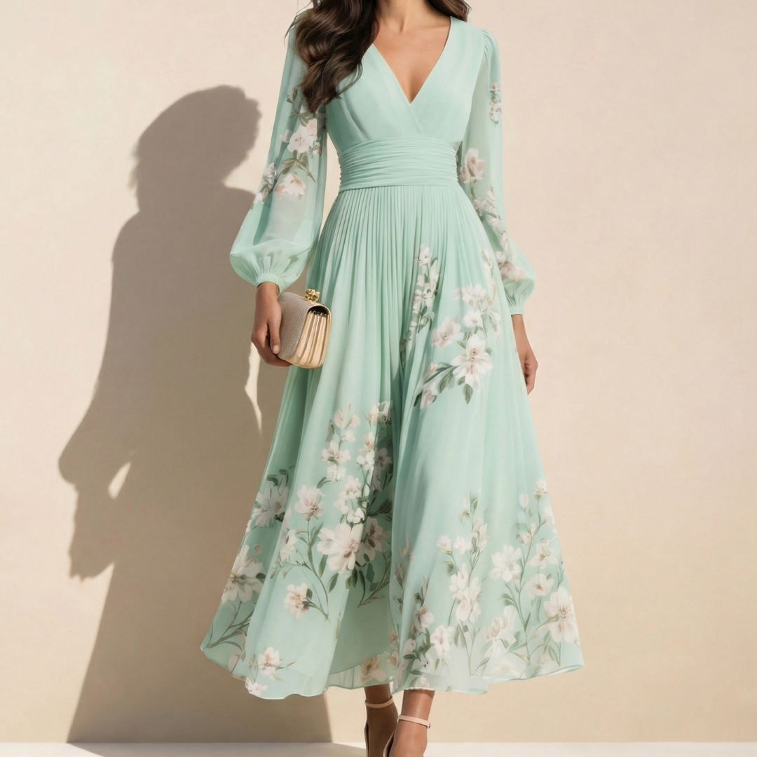 El vestido Coral está diseñado para realzar la silueta sin esfuerzo. Su tejido fluido en verde menta cae con movimiento natural, mientras la cintura fruncida define la figura y estiliza al instante.